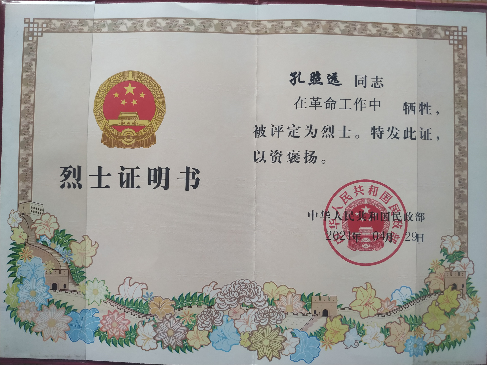 今年清明前夕,孔华和其家人在大连市烈士陵园祭拜孔照远烈士时,发现保存的烈士证明书和大连市烈士陵园墓碑及相关记录中的牺牲时间不一致。了解到这一情况后,营口市退役军人事务局高度重视,主动和孔华联系并积极与大连市相关部门协调,查阅中华英烈网、革命烈士英名录等资料,确定孔照远烈士的牺牲时间等相关内容。营口市退役军人事务局在和大连市退役军人事务局、大连市烈士陵园联系后,出具相关证明材料,后经报送辽宁省退役军人事务厅批准,已将相关信息更正。6月10日,市退役军人事务局工作人员来到孔华家,将重新制作的孔照远同志的烈士证送到了孔华手中。